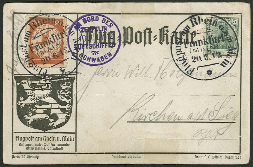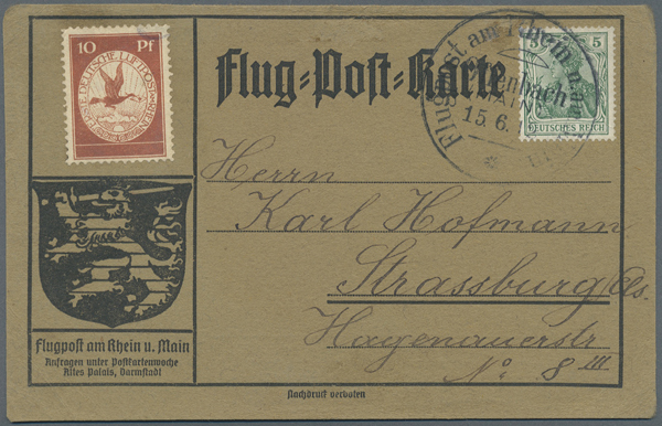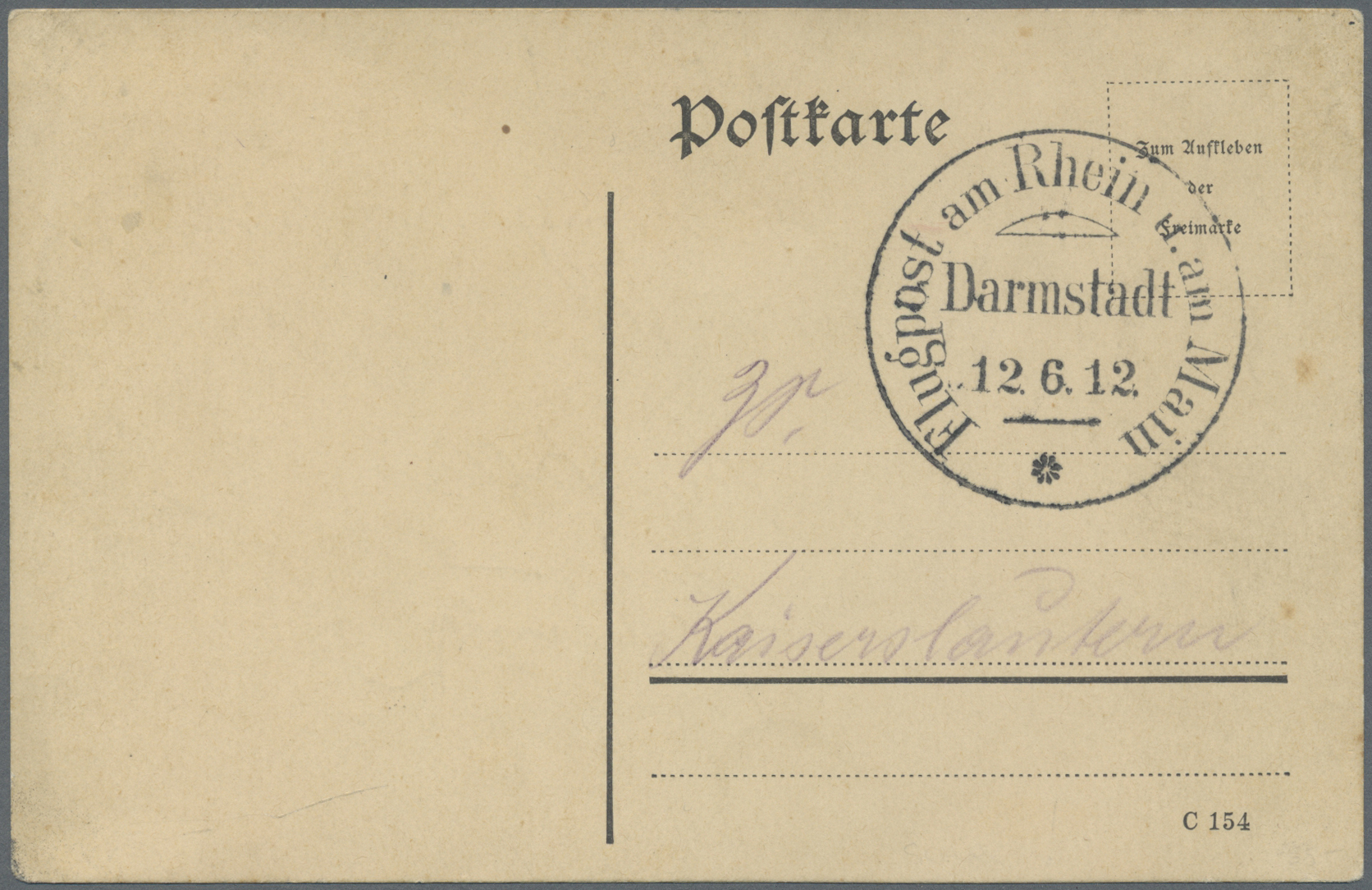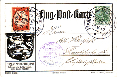 Den Postaufgabe-Sonderstempel sollte laut Anordnung des Reichspostamtes in Berlin nur die Reichspostmarke erhalten, die so genannte Luftmarke dagegen hatte, da sie eine private Ausgabe war, unentwertet zu bleiben. Aus Unachtsamkeit wurde diese Weisung von den Ober- Postdirektionen Frankfurt und Darmstadt so nicht weitergeben. In der Verfügung der Kaiserlichen Ober-Postdirektion Darmstadt vom Freitag, dem 07. Juni 1912 wurden die Kaiserlichen Postämter Darmstadt 1, Offenbach, Mainz 1, sowie Worms u.a. wie folgt angewiesen: